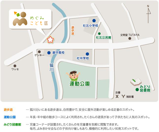 園の周りに公共施設がたくさんあり、いろんな世代の人と交流をはかることができます。交通の便にも恵まれています。