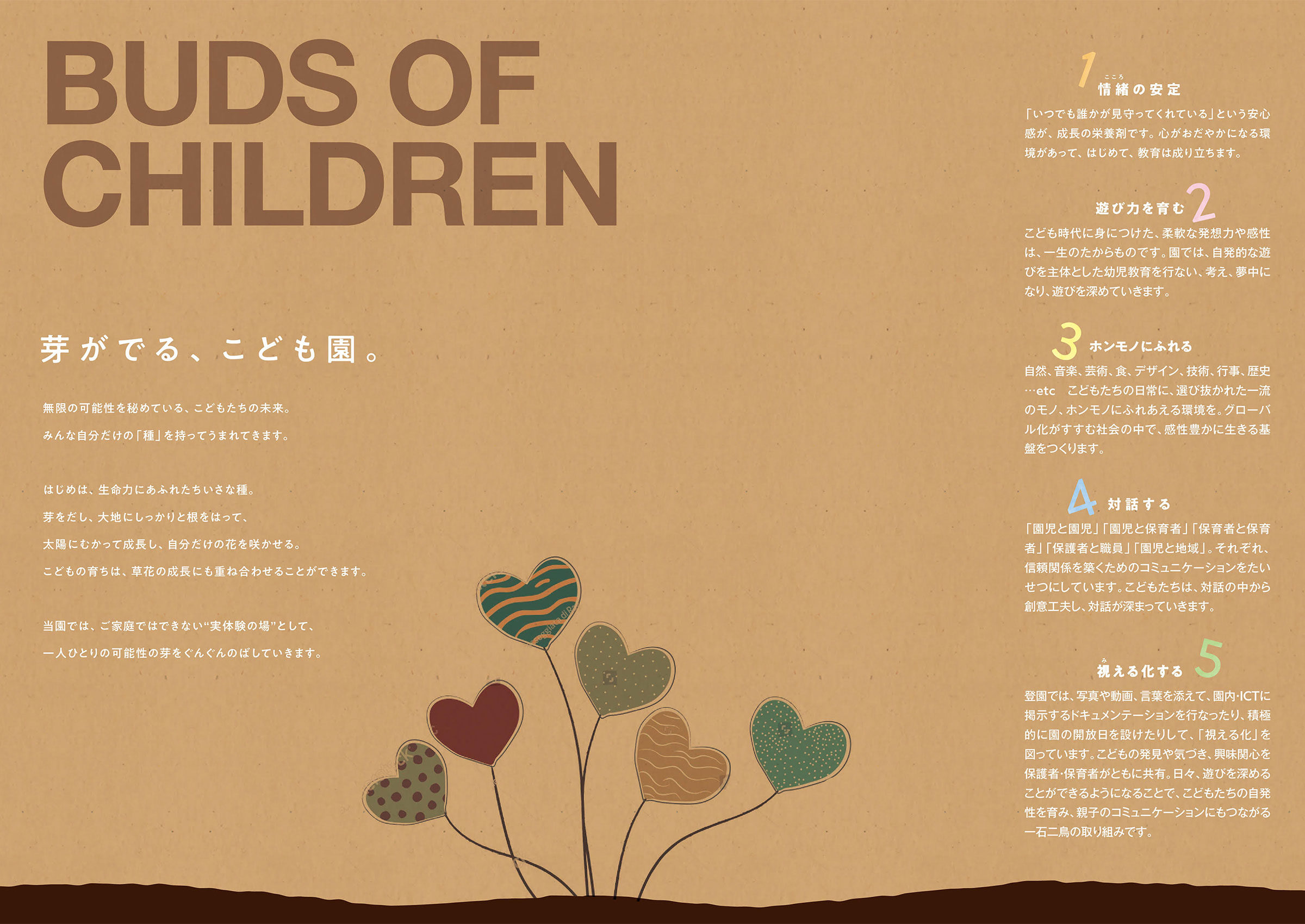 はじめは、生命力にあふれたちいさな種。芽をだし、大地にしっかりと根をはって、太陽にむかって成長し、自分だけの花を咲かせる。こどもの育ちは、草花の成長にも重ね合わせることができます。